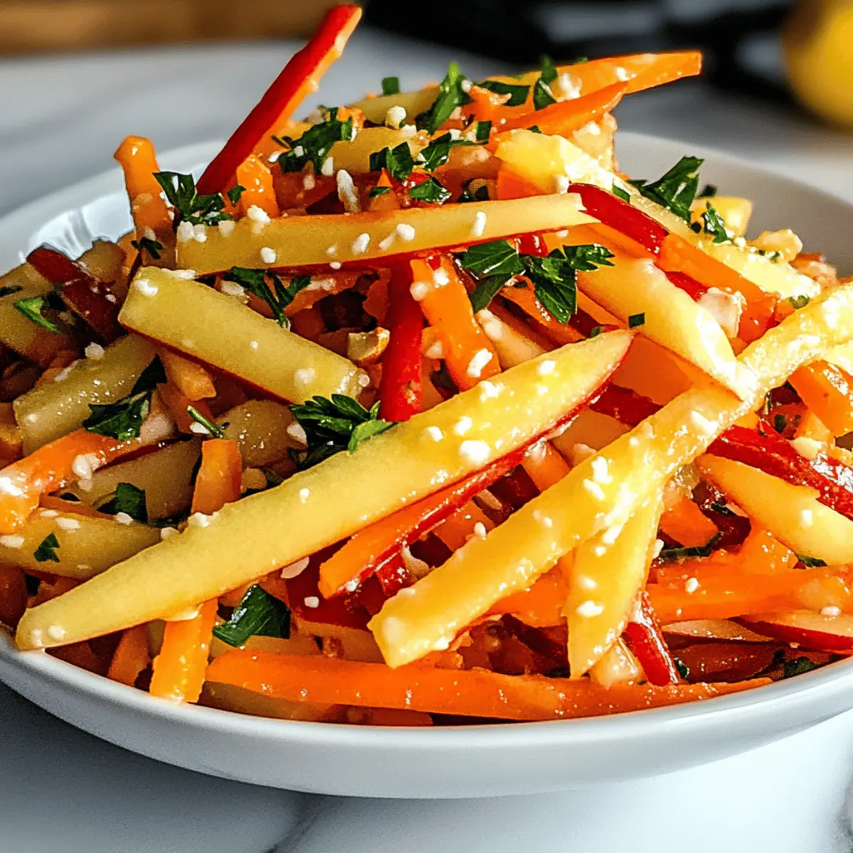 In the swirl of vibrant colors at my local farmer’s market, I stumbled upon the most enticing sight: a pile of crisp carrots and shiny apples, just begging to be transformed into something delightful. That’s how my beloved Carrot Apple Salad with Creamy Yogurt Dressing was born! This dish stands out not just for its refreshing combination of sweet and crunchy textures, but also because it’s an absolute breeze to prepare. It’s perfect for sunny days, family gatherings, or as a nutritious meal prep option when you need something quick yet satisfying. Packed with wholesome goodness like fiber and antioxidants, this salad is a wonderful way to boost your health while tantalizing your taste buds. Curious to see how you can create your version of this easy salad? Let’s dive into the recipe! Why Will You Love This Salad? Versatile: The Carrot Apple Salad allows you to customize it according to your taste—add nuts for crunch or try different dressings for a fresh spin! Nutritious: Packed with fiber and antioxidants, it supports digestive health and offers a guilt-free indulgence. Easy Preparation: With just a few ingredients and minimal prep time, you can whip this up for lunch or dinner without breaking a sweat. Perfect for Meal Prep: This salad holds up well in the fridge, making it an excellent choice for meal prep or to enjoy throughout the week. Crowd-Pleaser: The combination of sweet apples and crunchy carrots makes it a hit with kids and adults alike—even those who typically shy away from salads. If you’re looking for more delicious salad inspiration, check out this Napa Chicken Salad with Sesame Dressing for a heartier option! Carrot Apple Salad Ingredients Ready to create a vibrant Carrot Apple Salad? Here’s everything you’ll need! For the Salad • Carrots – Their earthy crunch brings a delightful texture while providing vitamins. • Apples – Choose Honeycrisp for sweetness or Granny Smith for a tart twist; both add essential fiber. For the Dressing • Yogurt – A creamy base, rich in calcium; opt for dairy-free yogurt if needed. • Lemon Juice – Essential for adding a zesty kick and balancing the sweetness of the apples. • Salt – Just a pinch enhances all the flavors in your dressing. Add-Ins (Optional) • Nuts – Feel free to add walnuts or almonds for extra crunch and healthy fats. • Raisins – Sweetens the salad naturally; a great alternative to sugar! • Sunflower Seeds – Adds a nutty flavor and an interesting texture. Prepare your ingredients and get ready to enjoy a refreshing Carrot Apple Salad that’s not only nutritious but also delicious! Step‑by‑Step Instructions for Carrot Apple Salad Step 1: Prepare Ingredients Begin by washing and peeling the carrots. Using a box grater or a food processor, grate about 2 cups of fresh carrots until they resemble fine strands. Next, choose 2 crisp apples, such as Honeycrisp or Granny Smith, and chop them into bite-sized pieces. This preparation should take approximately 10 minutes. Pat the apple pieces dry with a paper towel to prevent your salad from becoming watery. Step 2: Mix the Dressing In a medium-sized mixing bowl, combine 1 cup of yogurt, the juice of one lemon, and a pinch of salt. Whisk these ingredients together until smooth and creamy, ensuring there are no lumps left in the yogurt. This step should take around 5 minutes and will yield a delightful dressing that balances the sweetness of the apples and the earthiness of the carrots in your Carrot Apple Salad. Step 3: Combine the Salad In a large mixing bowl, toss the grated carrots and chopped apples gently. This blending should happen right after the prep to maintain freshness and crunch. Using a spatula, fold in the yogurt dressing you prepared earlier, making sure every piece is coated evenly. Aim to mix this for about 3 minutes until the salad looks vibrant and well-combined, showcasing the lovely colors of your Carrot Apple Salad. Step 4: Chill Once your salad is well-mixed, cover the bowl with plastic wrap and place it in the refrigerator. Allow it to chill for at least 1 hour; this resting time enhances the flavors as they meld together beautifully. The salad should be served cold, so make sure it stays chilled until you’re ready to share it with family or friends. Step 5: Serve and Enjoy After chilling, give your Carrot Apple Salad a gentle toss to re-mix any settled ingredients. Serve it in a colorful bowl, showcasing its bright, appealing colors. You can also top it off with a sprinkle of nuts or sunflower seeds for added crunch and flavor. Make this vibrant salad the centerpiece of your meal, perfect for sharing at gatherings or as a refreshing side on warm days! How to Store and Freeze Carrot Apple Salad Fridge: Keep your Carrot Apple Salad in an airtight container for up to 3 days. This will preserve its crunch and prevent excess moisture. Apples Freshness: To avoid browning, it’s best to add chopped apples just before serving if you plan to enjoy the salad over multiple days. Freezer: While not recommended for freezing, if you must, store it in a freezer-safe container. It can be frozen for up to a month, but the texture may suffer. Reheating: This salad is best served cold. For optimal flavor and texture, enjoy it fresh rather than reheated. Expert Tips for Carrot Apple Salad Choose Fresh Produce: Always select crisp, fresh carrots and apples. They elevate the crunch and sweetness, making your Carrot Apple Salad even more delightful. Prevent Browning: To keep your apples from turning brown, coat them in lemon juice immediately after cutting. This simple trick maintains the salad’s vibrant appearance. Dressing Consistency: If you prefer a creamier dressing, add more yogurt gradually. For a tangier flavor, incorporate additional lemon juice, balancing the sweetness of the apples. Make Ahead Magic: Prepare the salad a few hours in advance to deepen the flavors. Just remember to add the apples right before servin