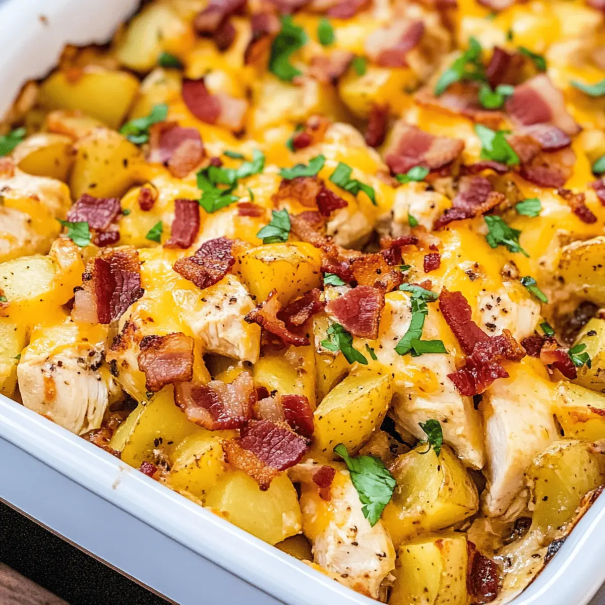 You know that feeling when the aromas of a home-cooked meal waft through the air, instantly lifting your spirits? That’s exactly what this Loaded Chicken and Potato Casserole offers—a warm embrace of flavors that’s sure to bring everyone to the table. With succulent, juicy chicken, crispy bacon, and creamy cheddar, this one-pot wonder is not just a comforting dish, but a quick and easy solution for busy weeknight dinners. It’s perfect for family gatherings, delivering both hearty satisfaction and a delightful texture in every bite. Plus, cleanup is a breeze! Curious about how to make this deliciously simple recipe a staple in your kitchen? Let’s get cooking! Why Is This Casserole a Must-Try? Comforting and hearty, this Loaded Chicken and Potato Casserole is the epitome of home-cooked satisfaction. One-Pot Wonder: With everything cooked in a single dish, cleanup becomes a breeze after dinner. Quick Preparation: Perfect for busy evenings, this recipe allows you to whip up a delicious meal without hassle. Crowd-Pleaser: Your family will love the savory flavors of chicken, bacon, and melted cheese, making it an ideal choice for gatherings. Versatile: Feel free to customize it by adding veggies or swapping proteins for a personal touch! It’s truly a dish that will become a beloved staple. If you’re craving something lighter, consider pairing it with a refreshing Napa Chicken Salad for an ideal meal combo! Chicken and Potato Casserole Ingredients • Here’s everything you need to create a cozy Chicken and Potato Casserole! For the Casserole Cooking Spray – Prevents sticking in the casserole dish; olive oil can be a great substitute. Chicken Breasts – 2 pieces, cooked and cubed for a hearty protein boost; grilled or roasted chicken works perfectly. Red Potatoes – 6 medium, cubed with skin on, providing bulk and texture; Yukon gold works well too. Garlic Clove – 1, minced to infuse depth and flavor; feel free to use garlic powder if fresh isn’t on hand. Olive Oil – 3 tablespoons to help with roasting and enhance flavor; melted butter is a delicious alternative. Paprika – 1 tablespoon for smoky warmth; smoked paprika can take it to the next level! Dried Parsley – 1 tablespoon for herbal notes; substitute with fresh parsley (3 tablespoons) for a burst of freshness. Dried Oregano – 1 teaspoon compliments the dish with earthy flavor; adjust quantities if using fresh oregano. Cayenne Pepper – 1 teaspoon to add a spicy kick; simply omit for a milder flavor. Bacon Strips – 8, cooked and chopped, contributing savory goodness; lean turkey bacon is a wonderful option! For Toppings Shredded Sharp Cheddar Cheese – 2 cups for creaminess and richness; feel free to swap in Monterey Jack or any melty cheese you prefer. Green Onions – 1/2 cup, sliced for a fresh, crisp finish; chives work beautifully as a substitute. For Seasoning Salt and Pepper – To taste, balancing and enhancing all the delightful flavors in your casserole. This Chicken and Potato Casserole is truly a comforting dish perfect for any occasion! Step‑by‑Step Instructions for Loaded Chicken and Potato Casserole Step 1: Preheat and Prepare Preheat your oven to 375°F (190°C) while you prepare your casserole dish. Generously spray a 9 x 13-inch casserole dish with cooking spray to prevent sticking. This essential step ensures your Loaded Chicken and Potato Casserole comes out easily and stays intact during serving. Step 2: Combine Ingredients In a medium mixing bowl, combine the cubed red potatoes, cooked and cubed chicken breasts, minced garlic, olive oil, paprika, diced dried parsley, oregano, cayenne pepper, salt, and pepper. Mix everything together until the chicken and potatoes are evenly coated with the seasonings, creating a flavorful base for your casserole. Step 3: Transfer to Baking Dish Carefully transfer the chicken and potato mixture into the prepared casserole dish. Spread it out evenly to ensure that everything cooks uniformly. The mixture should look vibrant and well mixed, ready for the oven. This step is crucial for a delightful texture throughout your Loaded Chicken and Potato Casserole. Step 4: Bake to Perfection Place the casserole dish in your preheated oven and bake for 45-50 minutes. During this time, the potatoes should become tender, and the chicken will absorb all the seasoned flavors. When it’s done, you can check for doneness by piercing a potato with a fork—it should glide through easily. Step 5: Add Toppings Once the casserole is cooked, remove it from the oven and layer it with the chopped bacon, shredded sharp cheddar cheese, and sliced green onions. Spread these toppings evenly over the hot casserole; the cheese should start melting immediately, creating that comforting, gooey texture we all love in a Loaded Chicken and Potato Casserole. Step 6: Final Bake Return the casserole to the oven for an additional 5-10 minutes, or until the cheese is thoroughly melted and bubbly. Keep an eye on the dish to avoid over-browning the cheese. The aroma wafting through your kitchen will be irresistible and a sign that dinner is almost ready! Step 7: Serve and Savor Remove your Loaded Chicken and Potato Casserole from the oven and let it sit for a few minutes before serving. This resting time allows the flavors to meld beautifully. Scoop out generous portions for your family and enjoy a delightful meal that brings everyone together around the table. Expert Tips for Chicken and Potato Casserole Prep Ahead: Start by prepping your ingredients in advance to save time during dinner preparation. Having everything ready makes it easy to quickly assemble your casserole. Avoid Overcrowding: When placing the mixture in the casserole dish, make sure to spread it evenly without overcrowding. This will ensure uniform cooking and help the potatoes achieve that perfect tenderness. Quality Ingredients: Use fresh and high-quality chicken and bacon for the best flavor in your Chicken and Potato 