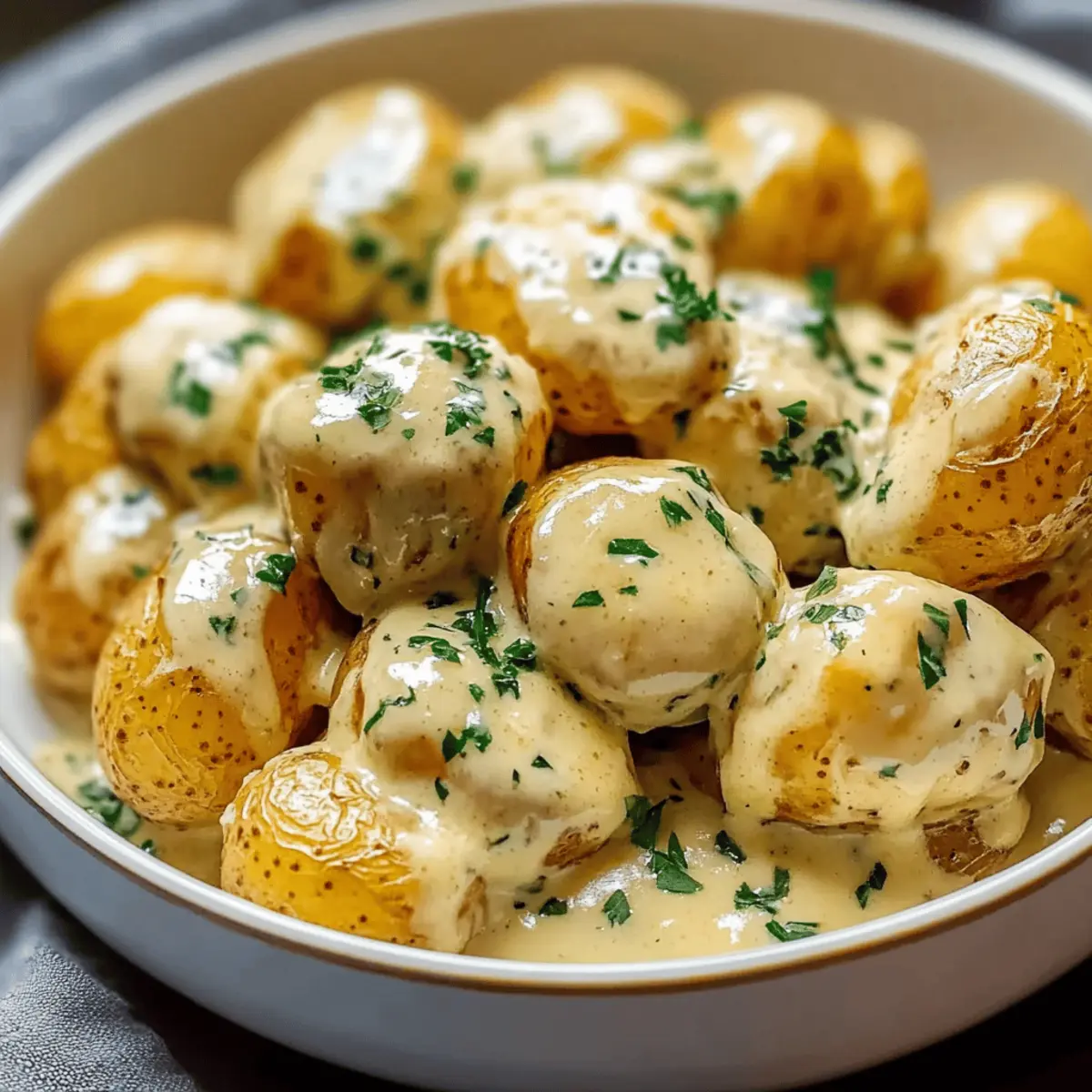 As I stood in my kitchen, the aroma of sizzling garlic filled the air, and I found myself grinning at the bubbling pot of creamy goodness that would soon envelop my tender baby potatoes. With a few simple ingredients, these Creamy Garlic Sauce Baby Potatoes transform into an indulgent side dish that feels like a warm hug on a plate. Not only are they quick to prepare, making weeknight dinners a breeze, but they also elevate any meal, easily accompanying chicken, steak, or even seafood. Trust me, this vegetarian-friendly delight is destined to become a favorite at your table. Curious how to make these luscious bites that redefine comfort food? Let’s dive in! Why are Creamy Garlic Sauce Baby Potatoes a must-try? Irresistible Comfort Food: These Creamy Garlic Sauce Baby Potatoes will instantly elevate your dining experience with their rich, cozy flavor. Quick and Easy: With just a handful of ingredients and simple steps, this recipe is perfect for busy weeknights or last-minute gatherings. Versatile Pairing: Whether served alongside Spicy Garlic Butter seafood, roasted meats, or grilled veggies, they complement any dish beautifully. Crowd-Pleasing Appeal: Friends and family won’t be able to resist these creamy, buttery bites that bring smiles to the table. Healthier Indulgence: This vegetarian-friendly side dish provides comfort without the guilt, making it great for everyone! Creamy Garlic Sauce Baby Potatoes Ingredients For the Potatoes • Baby Potatoes – Tender and sweet, these shine in the creamy sauce, but feel free to use red, yellow, or mixed varieties. For the Sauce • Olive Oil or Butter – Richness is key here; use unsalted butter for better seasoning control. • Garlic – Fresh minced garlic provides depth, or substitute with roasted garlic for a milder touch. • Heavy Cream – For a decadent, velvety sauce; half-and-half can lighten it slightly, but avoid milk as it may be too thin. • Chicken or Vegetable Broth – Enhances the flavor of the sauce, and opting for low-sodium is always a smart choice. • Salt & Black Pepper – Essential seasonings to enhance flavors; adjust these to match your taste preferences. • Dried Thyme or Italian Seasoning – Herbaceous notes bring a lovely aroma; feel free to swap in fresh herbs if available. • Parmesan Cheese (optional) – Adds a nutty flavor and depth; sprinkle it in just before serving for a delightful finish. • Fresh Parsley (for garnish) – Brightens the dish, striking a perfect balance with the creaminess. These Creamy Garlic Sauce Baby Potatoes are not only simple to make but will quickly become a beloved part of your family meals! Step‑by‑Step Instructions for Creamy Garlic Sauce Baby Potatoes Step 1: Prep Potatoes Start by rinsing your baby potatoes under cool water to remove any dirt. If you’re using larger baby potatoes, cut them in half or quarters for even cooking. Place them in a large pot, and add enough water to cover the potatoes. Add a generous pinch of salt to enhance flavor while they cook. Step 2: Cook Potatoes Bring the pot of salted water to a boil over medium-high heat. Once boiling, reduce to a simmer and cook the potatoes for 12-15 minutes, or until they are fork-tender. You’ll know they’re ready when you can easily pierce them with a fork. Drain the potatoes in a colander and set them aside while you prepare the creamy sauce. Step 3: Make Sauce In a large skillet, heat 2 tablespoons of olive oil or unsalted butter over medium heat. Once hot, add minced garlic (and optional finely chopped onion if desired) and sauté for about 1-2 minutes or until the garlic is fragrant and translucent. Be careful not to let it brown, as this can lead to bitterness in your Creamy Garlic Sauce Baby Potatoes. Step 4: Combine Smooth Ingredients Stir in 1 cup of heavy cream and ½ cup of chicken or vegetable broth into the skillet. Season the mixture with salt, black pepper, and your choice of dried thyme or Italian seasoning. Allow this rich mixture to simmer for 3-4 minutes, stirring occasionally, until it thickens slightly and a luxurious sauce forms. Step 5: Toss Together Gently add the cooked baby potatoes to the creamy sauce in the skillet, carefully tossing them to coat fully. If desired, incorporate ½ cup of grated Parmesan cheese into the mixture for an extra burst of flavor. Let them simmer together for an additional 2-3 minutes, ensuring the potatoes absorb the delightful creaminess. Step 6: Serve Once plated, garnish your Creamy Garlic Sauce Baby Potatoes with freshly chopped parsley to add a vibrant touch. Serve them warm, and watch them disappear as friends and family indulge in this comforting side dish that perfectly complements any meal. Creamy Garlic Sauce Baby Potatoes Variations Feel free to tailor these luscious Creamy Garlic Sauce Baby Potatoes to fit your preferences and dietary needs! Vegan Option: Swap butter for olive oil and replace heavy cream with coconut cream for a delightful plant-based twist. With this simple change, you’ll still achieve that creamy texture while enjoying a lighter, dairy-free version. Gluten-Free: Ensure your broth is gluten-free for a worry-free indulgence. Perfect for those with gluten sensitivities, this modification lets everyone enjoy. Herb Variations: Experiment with fresh or dried herbs like dill or basil to impart unique layers of flavor. Each herb offers a new taste profile, making these potatoes consistently exciting! Creamy Twist: For an extra luxurious sauce, blend in some mascarpone cheese along with the heavy cream. This rich addition brings a velvety element that pairs beautifully with the potatoes! Spicy Kick: If you’re craving a bit of heat, sprinkle red pepper flakes into the sauce to wake up your taste buds. Just a pinch can transform this dish into a spicy sensation without overpowering the comforting flavors. Baked Version: Coat the potatoes in sauce and bake at 375°F (190°C) for 15-20 minutes until golden and bubbly. Thi