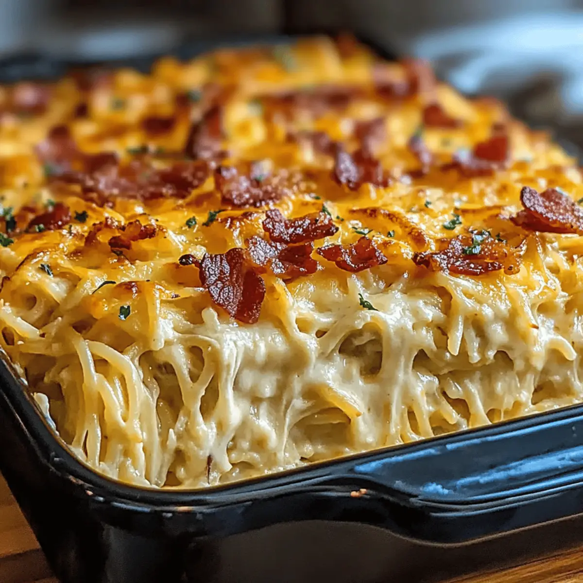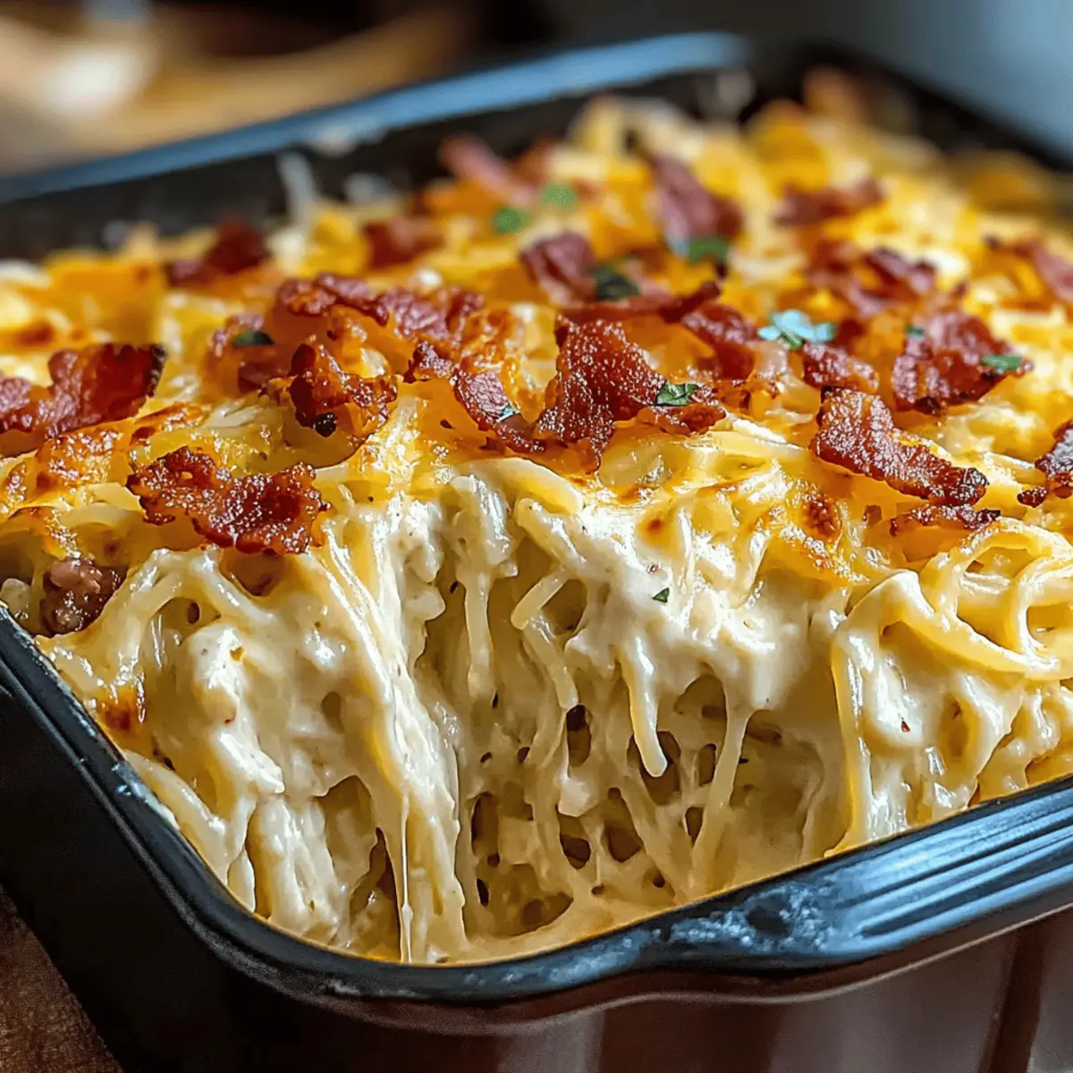 Have you ever stared into your fridge, longing for a dish that embraces you like a warm hug? That’s exactly how I felt when I first discovered the joy of a Creamy Southern Spaghetti Bake. This ultimate comfort casserole combines tender chicken with a creamy, cheese-packed sauce, topped with crispy bacon that makes every bite a celebration. Not only is this dish a family-friendly staple perfect for busy weeknights, but it also makes for a fabulous make-ahead option for gatherings. With just a handful of ingredients and a few simple steps, you can bring a taste of Southern hospitality right to your dinner table. Are you ready to dive into this creamy, cheesy delight that’s destined to become a favorite? Let’s get cooking! Why is this Casserole So Irresistible? Comforting Layers: This Creamy Southern Spaghetti Bake offers an indulgent blend of flavors and textures that truly comforts the soul. Effortless Preparation: With just a few simple ingredients, you can whip up this dish quickly, making it perfect for busy weeknights. Make-Ahead Magic: Prep it in advance and pop it in the oven when you’re ready—it’s a time-saver for when guests arrive unexpectedly or you need a hassle-free meal. Deliciously Versatile: Customize it effortlessly—swap chicken for turkey or add veggies like spinach or bell peppers for a twist. Crowd-Pleasing Flavor: Rich, creamy, and cheesy, it’s a dish that pleases everyone at the table, much like my other favorites, such as Peach Baked Oatmeal or Asian Chicken Meatballs. Each bite of this casserole not only brings joy but also sparks conversation and smiles, making every meal a delightful experience. Don’t miss out on the chance to create lasting memories around your dinner table! Creamy Southern Spaghetti Bake Ingredients This recipe celebrates the essence of comfort food with creamy goodness! For the Casserole Spaghetti – The base of this Creamy Southern Spaghetti Bake; cook until just al dente to maintain a good texture. Cooked Shredded Chicken – Adds protein and substance; rotisserie chicken is an excellent shortcut that saves time! Cream Cheese (8 oz) – Provides a rich, creamy texture for the sauce; be sure it’s softened for easy mixing. Cream of Chicken Soup (10.5 oz) – Contributes to the casserole’s creaminess; swap it with cream of mushroom for a vegetarian delight. Sour Cream (1 cup) – Enhances the dish’s richness; Greek yogurt can be used as a lighter alternative. Ranch Seasoning Mix (1 oz) – Infuses a distinctive flavor; feel free to use homemade ranch seasoning for a personal touch. Garlic Powder (1 tsp) – Adds aromatic depth; fresh minced garlic works beautifully for an extra punch. Black Pepper (0.5 tsp) – Adds a hint of mild heat; adjust to your taste preferences. Cheddar Cheese (2 cups, divided) – The star of the show, offering flavor and melty perfection; go for sharp cheddar for a bolder taste. Parmesan Cheese (0.5 cup) – Adds a savory kick and depth of flavor! Bacon (6 slices) – Brings a crispy crunch and smokiness; turkey bacon makes a great substitution or omit for a vegetarian option. Chopped Parsley (2 tbsp, optional) – A sprinkle of fresh parsley brightens the dish and adds a pop of color. Step‑by‑Step Instructions for Creamy Southern Spaghetti Bake Step 1: Preheat and Prepare Begin by preheating your oven to 350°F (175°C). Grease a 9×13-inch baking dish with cooking spray or butter to prevent sticking. Set it aside while you gather the ingredients. This initial step ensures that your Creamy Southern Spaghetti Bake will cook evenly and come out beautifully. Step 2: Cook Spaghetti In a large pot, fill with water and bring it to a boil. Add the spaghetti and cook until al dente, usually about 8-10 minutes. Drain the spaghetti in a colander and then set it aside. The pasta should be slightly firm to the bite, as it will continue to cook in the oven. Step 3: Mix Sauce In a mixing bowl, combine the softened cream cheese, cream of chicken soup, sour cream, ranch seasoning mix, garlic powder, and black pepper. Using a hand mixer or whisk, blend the ingredients until smooth and creamy. This rich sauce will become the heart of your Creamy Southern Spaghetti Bake, adding luscious flavor to each bite. Step 4: Combine Ingredients Gently fold in the shredded chicken, 1.5 cups of cheddar cheese, and Parmesan cheese into the prepared sauce. Then, add the drained spaghetti and mix until everything is evenly coated. You’ll want to see creamy strands of pasta enveloped in the delightful sauce, ensuring every serving is bursting with flavor. Step 5: Assemble Casserole Transfer the creamy mixture into the prepared baking dish, spreading it out evenly. Sprinkle the remaining cheddar cheese on top, and crumble the bacon pieces over it for an extra crunch. This layering not only adds flavor but will create a gorgeous cheesy crust once baked. Step 6: Bake Cover your assembled Creamy Southern Spaghetti Bake with aluminum foil to keep it moist, then place it in the preheated oven. Bake for 25 minutes, then remove the foil and continue baking for an additional 10-15 minutes, or until the top is golden brown and bubbly. The delicious aroma will begin to fill your kitchen as it bakes! Step 7: Rest & Serve Once baked, carefully remove the casserole from the oven and allow it to rest for 5–10 minutes. This resting time helps the flavors meld together and makes it easier to slice. Garnish with chopped parsley for a fresh pop of color, and then serve warm, delighting your family with this Creamy Southern Spaghetti Bake that’s sure to satisfy! What to Serve with Creamy Southern Spaghetti Bake To create a truly memorable meal, consider these delightful pairings that offer a variety of textures and flavors. Crispy Garlic Bread: Warm, buttery slices of garlic bread provide a crunchy contrast while soaking up the delicious sauce. Garden Fresh Salad: A simple vinaigrette salad with mixed greens and cherry tomatoes adds brig