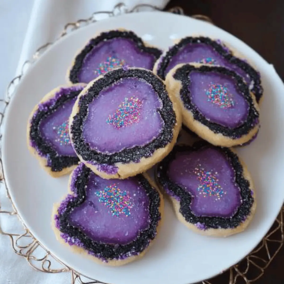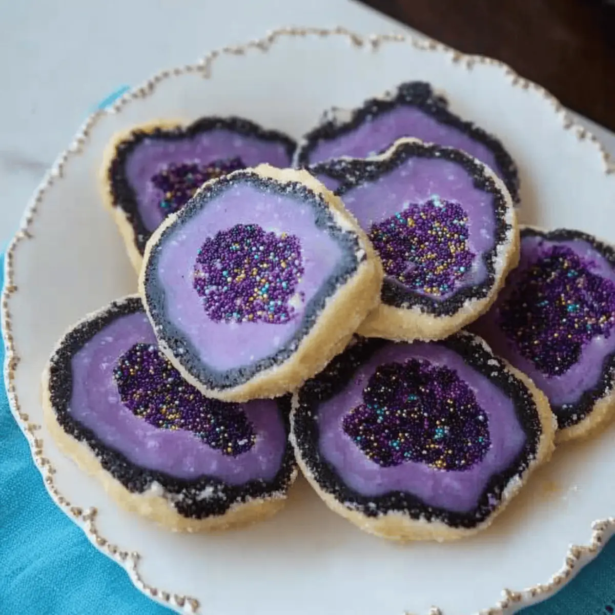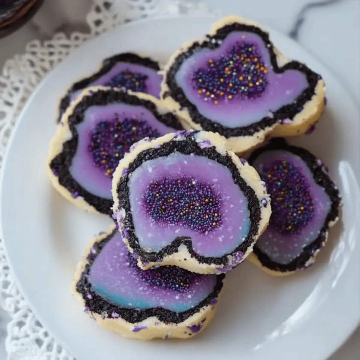 As I stood in my kitchen, surrounded by colorful sprinkles and a swirl of excitement, I couldn’t help but feel a little like an artist preparing for a grand exhibit. That’s when the idea for these fabulous Geode Cookies came to life! With their stunning resemblance to precious gemstones and a soft, buttery texture, these decorative cookies are perfect for festive occasions like birthday parties or family gatherings. Not only are they visually striking, but they are also a fun, kid-friendly project that brings everyone together in the kitchen. Trust me, who wouldn’t want to bite into a cookie that looks like a slice of nature’s finest treasures? Curious about how you can create these delicious and dazzling treats? Let’s dive into the delightful world of geode cookie-making! Why are Geode Cookies a Must-Try? Visual Delight: These cookies are not just tasty; they are a feast for the eyes, mimicking the beauty of real gemstones with vibrant colors and unique shapes. Kid-Friendly Fun: Making geode cookies is a perfect activity to engage kids in baking, nurturing their creativity as they mix and match colors. Rich, Buttery Flavor: The soft, buttery texture delivers a melt-in-your-mouth experience, elevating your dessert table to new heights. Versatile Variations: Customize your cookies by experimenting with different food colors and sprinkles, giving you endless possibilities for seasonal themes. Perfect for Celebrations: Whether it’s a birthday party or a festive gathering, these cookies add a delightful touch that will impress your guests. For more delicious treats, check out my Luscious Lemon Cookies for a refreshing twist! Geode Cookies Ingredients • Let’s create sweet gemstone treats! For the Dough Unsalted Butter – Provides rich flavor and moisture; substitute with margarine for a dairy-free version. Powdered Sugar – Sweetens the dough and helps achieve a smooth texture; can use granulated sugar but increase mixing time. Eggs – Binds ingredients and contributes moisture; for vegan cookies, substitute with applesauce (1/4 cup per egg). Milk – Adds moisture and helps blend the ingredients; replace with almond or any plant-based milk for a dairy-free option. Vanilla Extract – Adds depth of flavor; almond extract can be used for a different taste. For the Color Purple Gel Food Coloring – Provides vibrant color mimicry of amethyst geodes; other food colorings can be used for different effects. Black Gel Food Coloring – Adds depth and contrast to the cookie dough; omit for an all-white dough. For the Structure All-purpose Flour – Provides structure to the cookies; gluten-free all-purpose flour can be substituted for gluten-free cookies. Salt – Balances sweetness and enhances flavor; no substitutes necessary. For the Decoration Purple Sprinkles – Creates visual appeal, mimicking gemstones; any colorful sprinkles can be substituted for variation. Black/Chocolate Sprinkles – Enhances the geode effect with realistic coloring; omit for a more uniform look. With these ingredients in hand, it’s time to dive into the baking fun and craft your very own mesmerizing Geode Cookies! Step‑by‑Step Instructions for Geode Cookies Step 1: Prepare Dough In a large mixing bowl, cream together the unsalted butter and powdered sugar using an electric mixer for about 2 minutes until the mixture is light and fluffy. Add in the eggs and milk, mixing until fully combined. Gradually incorporate the all-purpose flour and salt, stirring until the dough is smooth and homogeneous, ensuring it’s sweet and buttery for your geode cookies. Step 2: Color Dough Once the dough is well combined, divide it into three equal parts. Leave one part uncolored for a traditional look, color the second part purple using gel food coloring, and tint the last part black. Knead each section to distribute the colors evenly, creating vibrant hues that will mimic the stunning geodes when baked. You’ll create beautiful colors that pop and delight! Step 3: Shape Dough Begin by rolling out the black dough on a floured surface into a rectangle, approximately 6×12 inches. Next, layer the white dough on top, lightly rolling it to fuse the two together. Spread the colored dough in the center, then generously sprinkle with purple sprinkles. Carefully roll the entire layered dough into a log shape, ensuring the layers remain intact to form gorgeous geode cookies. Step 4: Chill Wrap the log of dough tightly in plastic wrap and place it in the refrigerator to chill for at least 1 hour. This step is crucial as it allows the cookies to firm up, making them easier to slice later while ensuring they retain their shape during baking for that perfect geode effect. Step 5: Bake Preheat your oven to 375°F (190°C). Once the dough has chilled, remove it from the refrigerator and slice the log into 1/4-inch thick rounds. Arrange them spaced apart on a baking sheet lined with parchment paper. For an extra decorative touch, sprinkle the tops with additional purple sprinkles. Bake for 10 minutes or until the edges are lightly browned; they should look inviting and ready to enjoy. Step 6: Cool After baking, allow the geode cookies to cool on the baking sheet for about 10 minutes. This cooling period is essential, as it helps them set up perfectly, ensuring a delightful crunch on the outside with a soft, chewy center. Once cooled, gently transfer the cookies to a wire rack to cool completely, showcasing their stunning geode-like appearance. Geode Cookies Variations & Substitutions Feel free to explore the delightful world of customization with these Geode Cookies, making each batch uniquely yours! Dairy-Free: Swap unsalted butter with margarine and use plant-based milk for a lactose-free treat. Baking delightfully continues without sacrificing flavor! Vegan: Replace eggs with 1/4 cup applesauce per egg and you’ve got a cookie that’s just as delicious while being entirely plant-based. Gluten-Free: Use gluten-free all-pur