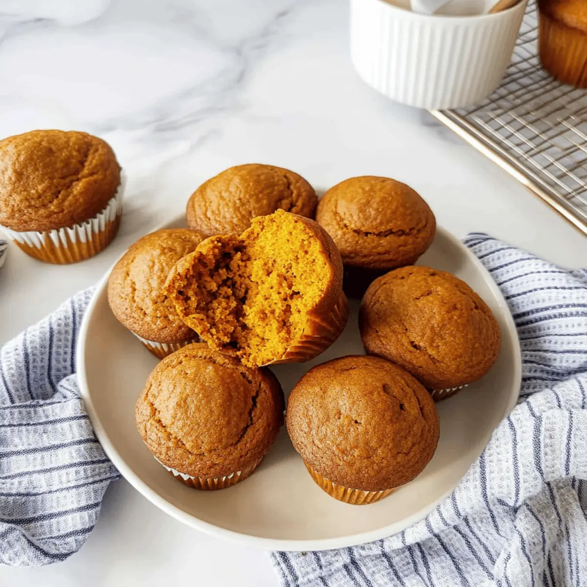 There’s something magical about the scent of pumpkin wafting through the kitchen, isn’t there? As the leaves turn and the air becomes crisp, I find myself reaching for a simple recipe that warms both the house and the heart—these Healthy Pumpkin Muffins. Perfectly moist and lightly spiced, they come together in under an hour, making them an ideal choice for busy mornings or cozy afternoon snacks. What I love most is their versatility: you can easily adapt them to be gluten-free or vegan, ensuring everyone can enjoy this treat. So, whether you’re enjoying them on your own or sharing a batch with friends, these muffins are bound to become a favorite in your home. Ready to dive into this comforting fall recipe? Why are Healthy Pumpkin Muffins a Must-Try? Moist and Tender: These pumpkin muffins boast a delectable texture that melts in your mouth, making each bite an absolute delight. Versatile Options: Easily adapt this recipe to be gluten-free or vegan, accommodating various dietary preferences without sacrificing flavor. Quick to Make: With prep and baking time under an hour, these muffins are a perfect choice for those busy mornings or when unexpected guests arrive. Crowd-Pleasing Flavor: Warm spices and rich pumpkin create a comforting taste that everyone will love, whether at breakfast or as a snack. Healthy Twist: Lower sugar content means you can indulge guilt-free, making them a great addition to your healthy eating repertoire. Perfect Pair: Enjoy them with your afternoon coffee or a cup of tea for a cozy treat. Looking for more wholesome snacks? Check out my Healthy Carrot Muffins or the deliciously satisfying Tuna Cakes Avocado to round out your meal plan! Healthy Pumpkin Muffin Ingredients For the Muffins • Pumpkin Puree – Provides moisture and vibrant pumpkin flavor; opt for canned or homemade. • Eggs – Adds structure and moisture; replace with ground flaxseed mixed with warm water for a vegan version. • Milk – Hydrates the batter; any dairy or plant-based milk works beautifully. • Coconut Oil/Vegetable Oil – Contributes richness and moisture; melted butter can be an excellent substitute. • Maple Syrup – Sweetness with a delightful flavor; honey or agave syrup can alternatively be used. • Apple Cider Vinegar – Enhances flavor and leverages the baking soda’s leavening; lemon juice is a worthy replacement. • Vanilla Extract – For added aroma and flavor; pure extract elevates the taste. • All-Purpose Flour – Provides structure; substitute with whole wheat flour for a heartier muffin. • Whole Wheat Flour – Increases fiber content; feel free to swap with all-purpose flour if needed. • Pumpkin Pie Spice – Infuses warmth and spice; if unavailable, a cinnamon-nutmeg blend works perfectly. • Baking Powder & Baking Soda – Essential for leavening; ensure they are fresh for optimal results. • Sea Salt – Enhances flavors, rounded out to perfection. These Healthy Pumpkin Muffins will soon become your go-to comfort food for the fall! Step‑by‑Step Instructions for Healthy Pumpkin Muffins Step 1: Preheat and Prepare Start by preheating your oven to 350°F (175°C) and greasing a 12-cup muffin tin with a light coating of oil or non-stick spray. This ensures your Healthy Pumpkin Muffins won’t stick when they’re baked to perfection. As the oven warms up, gather your ingredients to make the prep flow smoothly. Step 2: Mix Wet Ingredients In a large mixing bowl, combine the pumpkin puree, eggs (or ground flaxseed mixture for vegan muffins), milk, coconut oil, maple syrup, apple cider vinegar, and vanilla extract. Use a whisk to blend the ingredients together until the mixture is smooth and well combined, creating a rich base for your muffins. Step 3: Combine Dry Ingredients In a separate medium bowl, whisk together the all-purpose flour, whole wheat flour, pumpkin pie spice, baking powder, baking soda, and sea salt. This step is crucial to ensure that the leavening agents are evenly distributed, allowing your Healthy Pumpkin Muffins to rise beautifully without any clumps. Step 4: Fold Together Gently pour the dry ingredients into the wet mixture, using a spatula to fold them together. Stir just until you see no dry flour remaining; overmixing will yield dense muffins, and we want them to be light and fluffy! The batter should have a few lumps, indicating it’s ready for the next step. Step 5: Fill Muffin Cups Using a ⅓-cup measuring scoop, evenly fill each muffin cup with the batter, stopping just shy of the top to allow for rising. If you like, top them with nuts or chocolate chips for added flavor and texture. This is the moment when the aroma of fall truly begins to fill your kitchen! Step 6: Bake to Perfection Place the muffin tin in the preheated oven and bake for 18-20 minutes. Keep an eye on them—when a toothpick inserted into the center comes out clean or with a few crumbs, they’re ready! The tops should appear slightly golden and look firm to the touch. Step 7: Cool and Enjoy Once baked, remove the muffin tin from the oven and let it cool for about 10 minutes. This cooling period allows the muffins to set without falling apart. Carefully transfer them to a wire rack to cool completely, and then it’s time to enjoy your delicious Healthy Pumpkin Muffins! Expert Tips for Healthy Pumpkin Muffins Don’t Overmix: Stir the batter just until combined for light, fluffy muffins. Overmixing can lead to dense results, which we want to avoid! Cool Properly: Allow the muffins to cool in the tin for 10 minutes before transferring to a wire rack. This helps them set up and prevents crumbling. Check Freshness: Ensure your baking powder and baking soda are fresh for optimal leavening. Old leavening agents can lead to flat muffins. Adjust for Size: If you prefer larger muffins, use a ½-cup scoop for filling. Just remember to increase the baking time by a few minutes. Storage Tips: Keep your Healthy Pumpkin Muffins in an airtight contai