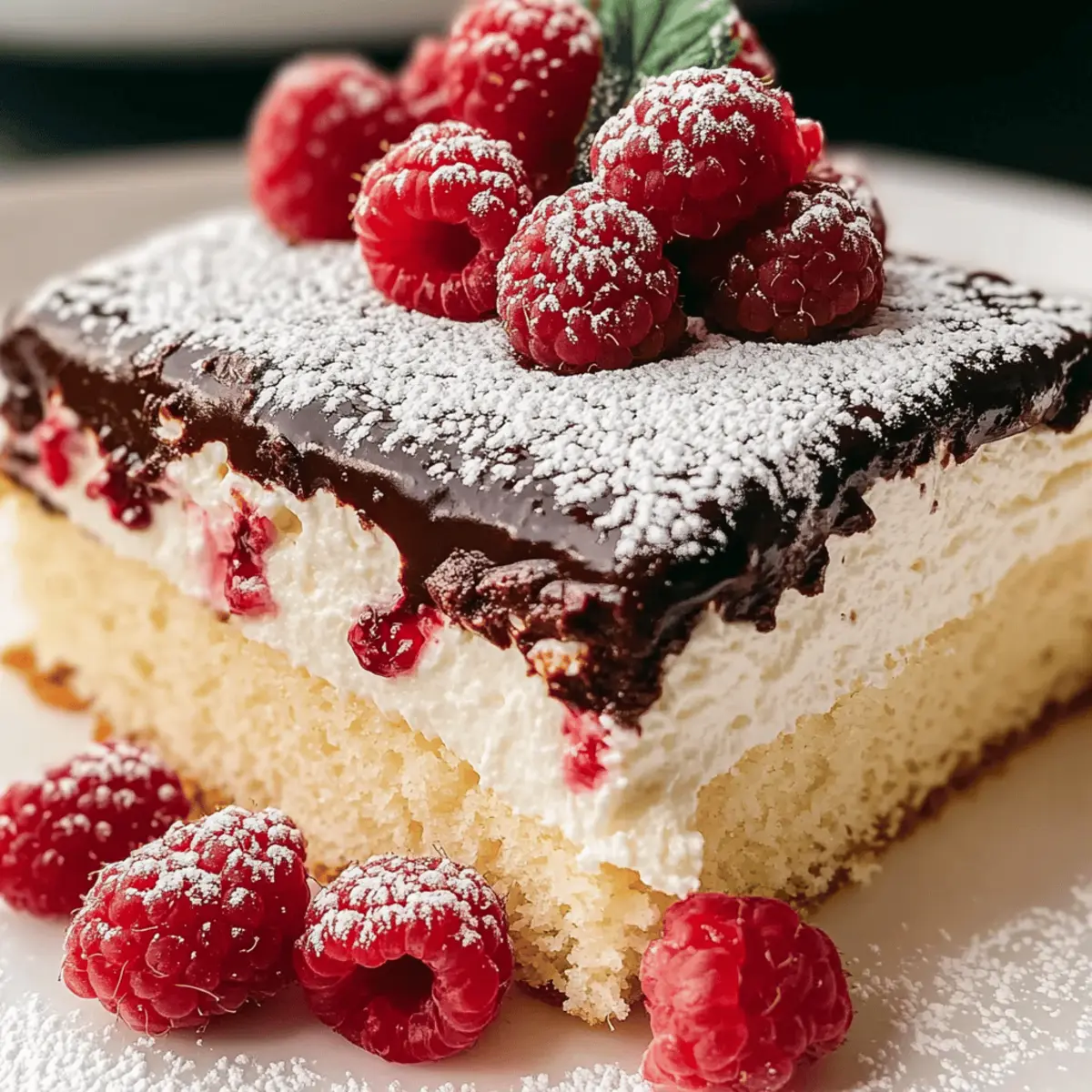 As I stood in my kitchen, the sun streaming through the window, a wave of nostalgia washed over me, bringing back sweet memories of family gatherings and the laughter that filled the air. It was in this spirit that I decided to create the Italian Vanilla Raspberry Love Cake, a dessert that not only looks stunning but also tastes like a warm hug. This cake is a delightful blend of moist vanilla sponge and creamy ricotta, layered to perfection and topped with fresh raspberries. The beauty of this recipe lies in its simplicity—prepping it doesn’t take much time, and it’s truly a showstopper for any occasion. Whether you’re celebrating a birthday or simply indulging in a cozy night in, this cake checks all the boxes for a light yet satisfying dessert. Ready to impress your loved ones with layers of flavor that evoke joy and nostalgia? Let’s dive in! Why is this cake a must-try? Visual Appeal: The Italian Vanilla Raspberry Love Cake is not just delicious; it’s a feast for the eyes! Its stunning layers create a beautiful presentation perfect for celebrations. Balancing Flavors: Each bite features the harmony of creamy ricotta and tart raspberries, ensuring a lovely blend of sweet and tangy flavors. Effortless Preparation: You don’t need to be a baking expert; this recipe uses simple ingredients and straightforward steps, making it accessible for everyone—perfect to impress guests without stress! Versatile Options: Feel free to play around with fruit toppings or glazes. Substitute the raspberries with strawberries or blueberries for a seasonal twist, or even try a white chocolate ganache for a lighter option. Better the Next Day: It gets better! The flavors meld beautifully overnight, making it an ideal make-ahead dessert for gatherings. You can even enjoy it alongside a scoop of Homemade Strawberry Shortcake or pair it with a cup of coffee! This cake truly embodies celebration and joy, making every bite meaningful. Let’s get started! Italian Vanilla Raspberry Love Cake Ingredients Get ready to create this delightful dessert! For the Ricotta Custard Ricotta Cheese – Use full-fat for a creamy, custard-like base that enhances flavor. Granulated Sugar – Sweetens the ricotta and balances the tartness of fresh berries. Vanilla Extract – Infuses each layer with delicious flavor and elevates sweetness. Eggs – Ensure they’re at room temperature to help bind the custard perfectly. For the Cake Base Cake Mix (vanilla, white, or yellow) – A simple choice for the sponge that streamlines your prep time. Neutral Oil (vegetable or canola) – Adds moisture; can be swapped with melted butter for richness. Water – Helps achieve the right consistency in your cake batter. For the Ganache Semi-Sweet Chocolate Chips – These provide a rich flavor that beautifully complements the cake. Heavy Cream – Ensures a smooth, shiny ganache; milk can substitute for a lighter glaze. For the Toppings Fresh Raspberries – Adds a delightful tartness and vibrant color; strawberries or blueberries can work as tasty substitutes. Powdered Sugar – A sprinkle enhances the visual appeal and gives a touch of sweetness. Fresh Mint Leaves – Optional garnish that adds freshness and color contrast. This Italian Vanilla Raspberry Love Cake is bound to become a favorite, inviting joy into every slice! Step‑by‑Step Instructions for Italian Vanilla Raspberry Love Cake Step 1: Preheat the Oven and Prepare the Dish Begin by preheating your oven to 350°F (175°C), ensuring it’s fully heated for even baking. While waiting, grease a 9×13-inch baking dish with non-stick spray or butter, making sure every corner is covered. This step is crucial for your Italian Vanilla Raspberry Love Cake to release easily after baking. Step 2: Mix the Ricotta Custard In a large mixing bowl, combine the ricotta cheese, granulated sugar, and vanilla extract. Use a hand mixer or whisk to blend until the mixture is smooth and creamy, about 2-3 minutes. Next, add the eggs one at a time, mixing just until incorporated. Be careful not to overbeat, as you want the custard to remain light and airy for the cake layers. Step 3: Prepare the Cake Batter In another bowl, mix the cake mix, neutral oil, water, and two additional eggs. Stir until the batter is smooth and well combined, ensuring no lumps remain. This should take about 2-4 minutes of gentle mixing. The batter will be thick but pourable—perfect for creating the light sponge layer of your Italian Vanilla Raspberry Love Cake. Step 4: Combine Cake and Ricotta Mixtures Pour the prepared cake batter into the greased baking dish, spreading it evenly to fill the bottom. Gently spoon the ricotta mixture on top of the batter, taking care to avoid mixing the two layers. The ricotta should sit slightly above the cake batter, creating a beautiful layered effect as it bakes. Step 5: Bake the Cake Place the dish in the preheated oven and bake for 55 to 65 minutes. Look for a golden top with a slight jiggle in the center when you gently shake the pan. To check for doneness, insert a toothpick into the cake; it should come out mostly clean with a few moist crumbs clinging to it. Step 6: Cool and Set the Layers Once baked, remove the cake from the oven and allow it to cool completely in the pan on a wire rack. This can take about 1-2 hours. The cooling process is essential for the layers to set properly and achieve that perfect texture in your Italian Vanilla Raspberry Love Cake. Step 7: Prepare the Ganache In a small saucepan, heat the heavy cream over medium heat until it just starts to simmer. Remove from heat and pour the hot cream over the semi-sweet chocolate chips in a mixing bowl. Let it sit for a minute before whisking together until the mixture is smooth and shiny, indicating that your ganache is ready to adorn the cake. Step 8: Add the Finishing Touches Once the cake has cooled, pour the glossy ganache evenly over the top, allowing it to cascade gently down the sides. Then, art