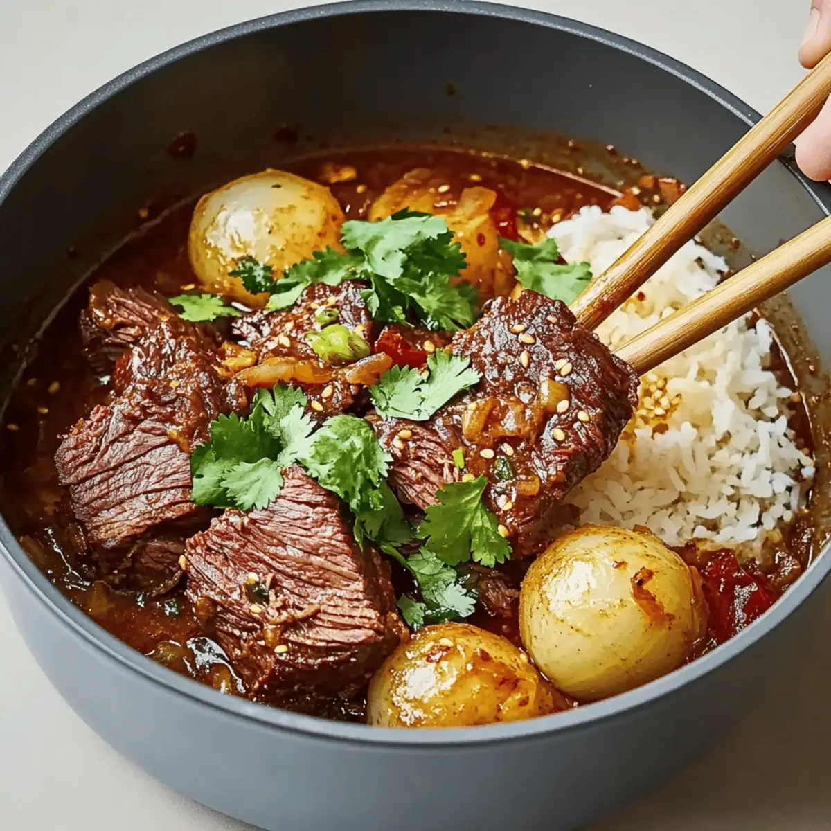 As my friends and I sat around the table, laughter mingled with the irresistible aroma wafting from my kitchen, I couldn’t help but feel grateful for the power of cooking. Today, I’m excited to share my take on a beloved classic—Korean Style Pot Roast. This dish not only blends traditional comfort food with vibrant Korean flavors but also whisks you away on a culinary adventure that evokes warmth and togetherness. With simple yet impactful ingredients, this pot roast is a game-changer for family gatherings or weeknight meals. After just a few hours of slow cooking, you’ll reveal a tender, juicy roast that’s perfect over rice and accompanied by tangy kimchi. The best part? It’s both a crowd-pleaser and freezer-friendly, making it a go-to for any occasion. Curious how to bring this flavorful fusion to your dinner table? Let’s dive into the recipe! Why is Korean Style Pot Roast a Must-Try? Bold flavors: This dish combines traditional pot roast goodness with spicy depth from gochujang, creating a unique taste explosion. Family-friendly: Perfect for gatherings, it offers hearty portions that will satisfy everyone, from kids to adults. Easy preparation: With straightforward steps to follow, you’ll spend less time in the kitchen and more with your loved ones. Versatile options: Feel free to swap beef for tofu or tempeh—making it easy to cater to various dietary needs, just like my Spiced Salmon with Potatoes. Freezer-friendly: This pot roast keeps well in the freezer, so you can always have a quick, comforting meal ready to go. Transform your mealtime with the warmth and richness of this Korean Style Pot Roast! Korean Style Pot Roast Ingredients For the Roast Beef Chuck Roast – Known for its savory, rich marbling, this cut becomes melt-in-your-mouth tender when slow-cooked. Kosher Salt – Essential for enhancing the meat’s natural flavor and creating a balanced taste. Vegetable Oil – For that perfect golden-brown crust; feel free to swap with olive or canola oil. For the Aromatics Sweet Onion – Adds a gentle sweetness and depth; yellow or white onions work great as alternatives. Garlic Cloves – Infuse wonderful aroma and flavor; garlic powder can be a handy substitute. Fresh Ginger – Delivers warmth and a zingy bite; ground ginger can fit the bill if fresh isn’t available. For the Sauce Gochujang – This fermented chili paste is the star ingredient, giving your pot roast a unique depth; substitute with chili sauce mixed with miso for a mild option. Brown Sugar – Balances the savory notes beautifully; you can use honey or maple syrup instead. Soy Sauce – Adds that rich umami flavor; tamari is a perfect gluten-free alternative. Beef Broth – Keeps the pot roast moist and flavorful; swap with vegetable broth for a lighter touch. For Serving Cooked Rice – A comforting base that absorbs all the delicious sauce; mashed potatoes can be a tasty alternative. Fresh Cilantro – Garnishes your dish with a pop of color and a refreshing taste; scallions or parsley can be used instead. Kimchi – A traditional side that pairs well with the richness of the roast, adding a tangy kick. Gather these delicious ingredients and prepare for an unforgettable Korean Style Pot Roast experience! Step‑by‑Step Instructions for Korean Style Pot Roast Step 1: Preheat the Oven Begin by preheating your oven to 350°F (175°C). This temperature is perfect for slow cooking the Korean Style Pot Roast, ensuring the beef becomes melt-in-your-mouth tender as it bakes. While the oven is warming up, gather your ingredients and equipment, including a heavy, oven-safe pot or Dutch oven. Step 2: Brown the Beef In your pot, heat a couple of tablespoons of vegetable oil over medium-high heat. Once the oil shimmers, carefully add the beef chuck roast. Sear the roast on all sides for about 3-4 minutes each until a rich, golden-brown crust forms. This step builds flavor, so don’t rush it. Once browned, remove the beef from the pot and set it aside. Step 3: Cook the Aromatics Using the same pot, add your sweet onion and sauté for 2-3 minutes until it starts to become translucent. Then, incorporate minced garlic and freshly grated ginger, cooking until fragrant—about 1 minute. The warm aromas will fill your kitchen, creating anticipation for the delicious Korean Style Pot Roast to come. Step 4: Mix the Sauces In a bowl, whisk together the brown sugar, gochujang, soy sauce, and beef broth until smooth. This savory-sweet sauce will enhance the flavors of the pot roast. Once combined, pour it over the sautéed onions, garlic, and ginger in the pot, stirring to coat evenly. Step 5: Bake the Pot Roast Return the browned beef to the pot, submerging it in the flavorful sauce. Cover the pot with its lid and transfer it to the preheated oven. Bake for 2 to 3 hours, or until the beef is fork-tender. You’ll know it’s ready when the kitchen fills with mouthwatering aromas, making it hard to wait! Step 6: Serve the Dish Once cooked, remove the pot from the oven and let the roast rest for about 10 minutes before slicing. Serve the tender Korean Style Pot Roast over fluffy cooked rice, drizzling the savory sauce on top. Garnish with fresh cilantro for a pop of color, and don’t forget to include some tangy kimchi on the side for a delightful contrast! Expert Tips for Korean Style Pot Roast Choose Wisely: Select a well-marbled beef chuck roast for optimal tenderness and flavor. Avoid lean cuts, as they can dry out during cooking. Slow and Steady: For a hands-off cooking method, consider using a slow cooker. Adjust the cooking time to ensure the meat is fork-tender and flavorful. Taste and Adjust: Always taste the sauce before baking. This allows you to modify the spice level with gochujang according to personal preference, ensuring a balance of flavors. Resting is Key: Allow the pot roast to rest for 10 minutes after cooking. This step ensures the juices redistribute through the meat, enhancing both flavo