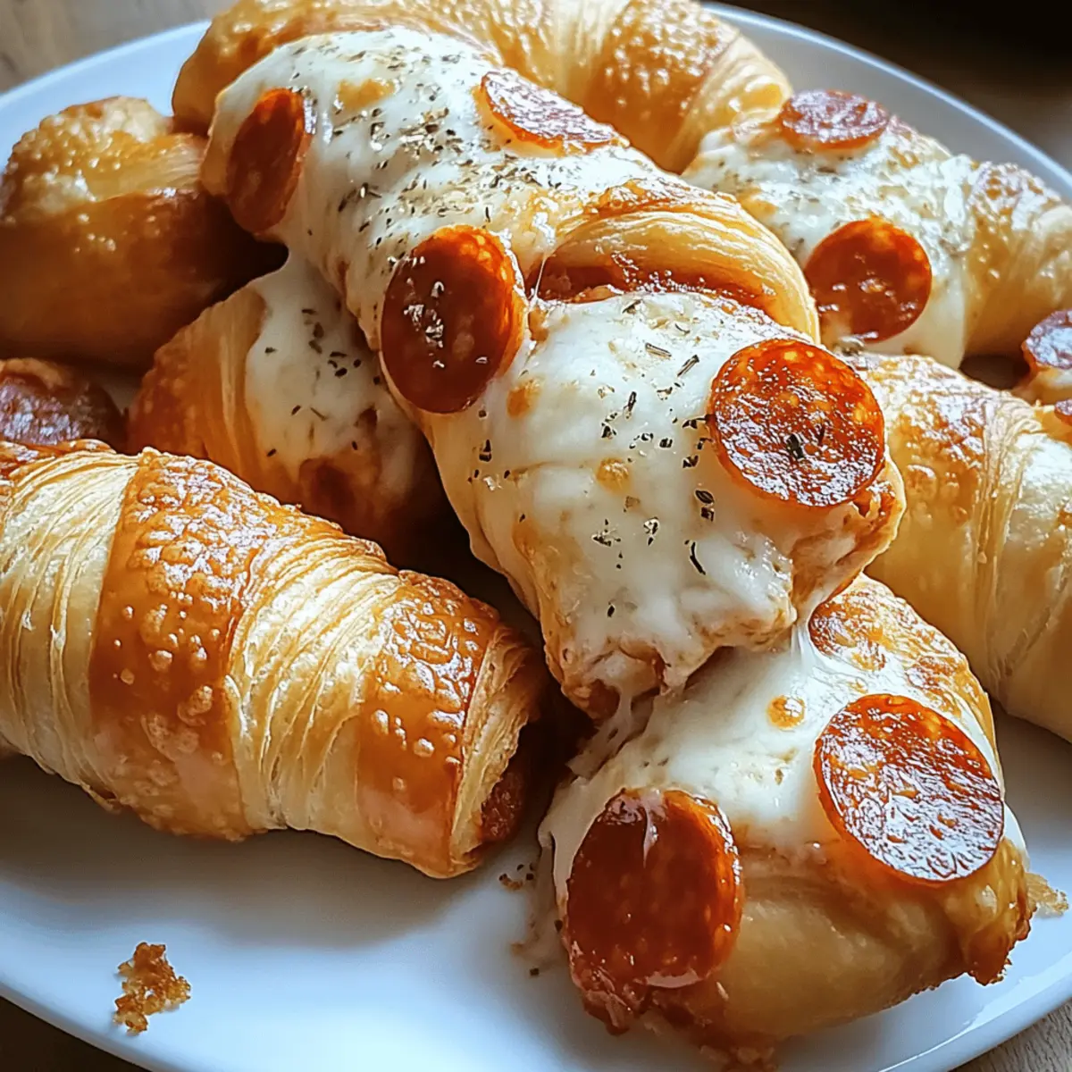 As I pulled apart the flaky layers of a fresh croissant, my mind drifted to that zesty combination of mozzarella and pepperoni that sings with each bite. Enter the Mozzarella Pepperoni Croissant Rolls, a scrumptious solution for those hectic days when you crave something homemade without the fuss. In just 30 minutes, you’ll transform simple crescent dough into a delightful appetizer that’s perfect for gathering friends or cozying up during game night. Not only are these rolls incredibly quick, but they’re also a versatile crowd-pleaser that can easily adjust to fit different palates. Ready to elevate your appetizer game? Let’s dive into this cheesy adventure together! What Makes These Rolls So Irresistible? Quick and Easy: In just 30 minutes, these delicious rolls can go from oven to table, making them perfect for busy weekdays or last-minute gatherings. Savory and Cheese-Filled: Each bite offers a delightful combination of gooey mozzarella and zesty pepperoni, ensuring a mouthwatering experience that’s hard to resist. Versatile Creations: Feel free to experiment with different fillings like veggies or alternate cheeses. The possibilities are endless! Crowd-Pleasing Snack: Whether it’s game night or movie marathons, these rolls are sure to impress your guests and keep them coming back for more. For more flavor-packed ideas, check out my delicious Prosciutto Wrapped Mozzarella or try making some colorful Vegan Sushi. Mozzarella Pepperoni Croissant Rolls Ingredients • Get ready to create a cheesy delight! For the Rolls Crescent Roll Dough – This flaky base is easy to work with; go for classic, reduced-fat, or even gluten-free. Mozzarella Cheese – Choose shredded for even melting, or use fresh slices for an upscale touch. Pepperoni – A classic choice that adds zest; consider alternatives like turkey or omit for a vegetarian version. Egg – Optional, but an egg wash will give your rolls a beautiful golden sheen. Butter – Enhances flavor and promotes browning; use plant-based butter to keep it dairy-free. Italian Seasoning – Offers aromatic depth; fresh herbs can elevate the taste even further. For Dipping Marinara Sauce – A delightful contrast that complements the cheesy rolls; serve warm for the best flavor! These Mozzarella Pepperoni Croissant Rolls are not only quick and easy but also perfect for satisfying those cravings! Step‑by‑Step Instructions for Mozzarella Pepperoni Croissant Rolls Step 1: Preheat the Oven Begin by preheating your oven to 375°F (190°C). This is crucial for achieving a perfectly flaky and golden crust for your Mozzarella Pepperoni Croissant Rolls. While the oven is warming up, gather your ingredients and prepare your baking sheet lined with parchment paper or a silicone mat for easy cleanup. Step 2: Prepare the Dough Open the can of crescent roll dough and gently separate it into triangles. Be careful not to tear the dough as you do this. This flaky layer will serve as the base for your savory rolls, so keeping it intact ensures that they’ll hold together beautifully when filled. Lay the triangles flat on your workspace, ready for filling. Step 3: Add the Fillings At the wide end of each triangle, place a slice of mozzarella cheese, followed by 3 slices of pepperoni. The creamy mozzarella will melt perfectly, while the zesty pepperoni adds that irresistible flavor. Make sure the layers don’t spill over the edges, as each roll needs to be sealed tightly to preserve its cheesy goodness while baking. Step 4: Roll the Croissants Start rolling each triangle from the wide end toward the pointy end, tucking in the filling as you go. Press the edges together firmly to seal them well. This step is essential for ensuring that none of the cheesy goodness escapes during baking. Arrange your rolled croissants pointing upwards on the prepared baking sheet, leaving space between them to allow for expansion. Step 5: Optional Egg Wash For a beautiful golden sheen, consider brushing the tops of your croissant rolls with a beaten egg. This step is optional but adds a lovely finish to your Mozzarella Pepperoni Croissant Rolls. If you prefer to skip this step, your rolls will still be delicious and appealing without the extra gloss. Step 6: Season with Butter Melt a couple of tablespoons of butter and mix in Italian seasoning for an extra burst of flavor. Brush this aromatic mixture generously over the tops of each roll. This will enhance the taste and promote browning as they bake, leading to a deliciously savory and appealing final product. Step 7: Bake the Rolls Carefully place the baking sheet in the preheated oven and bake for 12–14 minutes. Keep a close eye on the rolls; they should puff up and turn a lovely golden brown. This is the perfect sign that your Mozzarella Pepperoni Croissant Rolls are ready to come out, bringing their delightful aroma to your kitchen. Step 8: Cool and Serve Once baked, let the rolls cool on the baking sheet for about 3 minutes. This cooling period makes them easier to handle and enhances their flavor. Serve your warm Mozzarella Pepperoni Croissant Rolls alongside a small bowl of marinara sauce for dipping; the combination is simply irresistible and perfect for snacking! Helpful Tricks for Mozzarella Pepperoni Croissant Rolls Keep Dough Cold: Ensure your crescent roll dough is cold until you’re ready to work with it to prevent tearing during filling. Don’t Overfill: Avoid overstuffing the rolls with mozzarella and pepperoni; this can lead to bursting, making a mess in the oven. Golden Finish: For a gloriously shiny crust, brush your croissant rolls with an egg wash before baking. It makes a world of difference! Watch the Clock: Bake for 12-14 minutes, but keep an eye on them to avoid over-baking. Golden brown is your goal! Storage Tips: Store leftovers at room temperature for up to 2 hours, then refrigerate for up to 2 days. Reheat in the oven for best results, preserving that delectable texture. Dip with Style