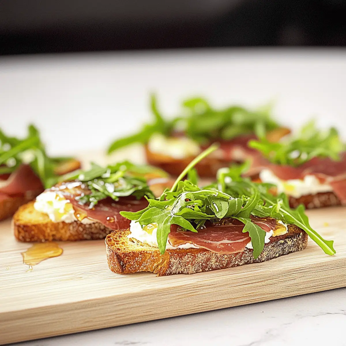 As I stood in my kitchen, the aromatic tease of freshly toasted bread beckoned me. I couldn’t wait to whip up an Easy Prosciutto Arugula Bruschetta with Honey Mascarpone that would become a delightful staple for any gathering. This elegant appetizer is not only quick to assemble but also offers a stunning presentation that will impress your guests. Picture creamy mascarpone layered on crusty bread, with the peppery arugula and savory prosciutto marrying perfectly under a drizzle of honey. It’s a treat that effortlessly combines sophistication with simplicity, making it a fantastic go-to for last-minute get-togethers or cozy nights in. Ready to impress with a delightful fusion of flavors? Let’s dive into this deliciously easy recipe! Why is Bruschetta Such a Crowd-Pleaser? Easy to Prepare: With no cooking required, you can whip up this bruschetta in minutes, making it a lifesaver for impromptu gatherings. Elegant Presentation: The vibrant layers of ingredients create a stunning visual appeal that will impress any guest. Customizable Flavors: Feel free to switch out ingredients like using Prosciutto Wrapped Mozzarella or experimenting with different cheeses for a unique twist. Perfect Balance: The combination of creamy mascarpone, salty prosciutto, and sweet honey strikes a perfect balance of flavors that tantalizes the taste buds. Versatile Serving Options: Pair the bruschetta with a glass of sparkling white wine or alongside a refreshing Caprese salad for a well-rounded meal. Vegetarian-Friendly: Swap out prosciutto for roasted vegetables or seasoned chickpeas, creating a delicious vegetarian alternative that everyone can enjoy. Prosciutto Arugula Bruschetta Ingredients For the Bread French Baguette – Offers structure and crunch; substitute with ciabatta or sourdough for a different twist. For the Creamy Layer Mascarpone Cheese – Adds creaminess and a mild flavor; can be swapped with cream cheese or ricotta for a similar texture. For the Savory Base Prosciutto – Brings rich, salty protein; alternatives like coppa or bresaola can add unique flavor profiles. For the Freshness Arugula – Provides peppery freshness that brightens the dish; baby spinach or mixed greens can serve as substitutes. For the Sweet Drizzle Honey – Adds a touch of natural sweetness that complements the bruschetta beautifully; try maple syrup for a delightful flavor twist. Step‑by‑Step Instructions for Easy Prosciutto Arugula Bruschetta with Honey Mascarpone Step 1: Toast Bread Begin by heating a skillet over medium-high heat, adding a splash of olive oil. Once hot, place the sliced French baguette in the skillet, toasting for about 4 minutes until the first side is golden brown. Flip the slices and continue to toast for another 3 minutes or until both sides are crisp and lightly browned. Remove and let cool slightly. Step 2: Spread Mascarpone Generously smear a layer of mascarpone cheese over each toasted baguette slice, creating a smooth and creamy base. You’ll want the rich mascarpone to cover the bread fully, allowing it to cradle the toppings. This creamy layer adds a luscious texture that balances beautifully with the other ingredients. Step 3: Add Prosciutto Tear pieces of prosciutto into manageable bite-sized portions, then layer them on top of the mascarpone. Make sure to distribute the prosciutto evenly, so every bite of your Easy Prosciutto Arugula Bruschetta features that rich, savory flavor. The prosciutto should drape elegantly over the cheese for a visually appealing presentation. Step 4: Top with Arugula Next, place a handful of fresh arugula over the prosciutto, ensuring to cover it evenly. The peppery notes of the arugula add a refreshing contrast, nice crunch, and brightness to your bruschetta. This step adds not only color but also an inviting taste profile that enhances the overall dish. Step 5: Drizzle Honey To finish your bruschetta masterpiece, drizzle a light stream of honey over the assembled ingredients. The honey will add a touch of sweetness, beautifully complementing the saltiness of the prosciutto and the creaminess of the mascarpone. Aim for a delicate drizzle to keep the flavors perfectly balanced. Prosciutto Arugula Bruschetta Variations Feel free to get creative and customize this bruschetta to suit your tastes and dietary needs, ensuring every bite is a delight! Dairy-Free: Substitute mascarpone with cashew cream or a dairy-free cream cheese alternative for the same luscious texture without the dairy. Flavor Explosion: Add a spread of roasted garlic or pesto beneath the mascarpone for a flavor boost, enhancing the savory elements of the dish. Veggie Delight: Swap prosciutto for roasted bell peppers or grilled zucchini for a beautiful vegetarian option that doesn’t compromise on flavor. Seasonal Fruits: Incorporate figs or thinly sliced peaches instead of honey for a sweet, juicy twist, perfectly complementing the savory layers. Herb Infusion: Sprinkle fresh basil or mint over the arugula for an aromatic kick; it will elevate the bruschetta to new fragrant heights. Spicy Kick: Drizzle some chili oil or add a few slices of fresh jalapeño for those who enjoy a bit of heat, providing an exciting contrast with the sweetness of honey. Nutty Crunch: Top with toasted walnuts or almonds for an added crunch that complements the creamy mascarpone and rich prosciutto beautifully. Hummus Base: Replace mascarpone with a layer of your favorite hummus for a lighter, protein-packed twist, perfect for a fresh, Mediterranean vibe. As you explore these variations, why not pair your bruschetta with some Tomato Bruschetta Elevates for a delightful platter, or serve it alongside the savory Prosciutto Wrapped Mozzarella to create a flavorful appetizer showcase that will leave your guests wanting more! What to Serve with Easy Prosciutto Arugula Bruschetta Elevate your dining experience with delicious pairings that complement the flavors of this beautiful bruschetta. Creamy Mashed Pot