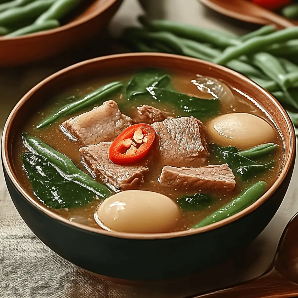 As the rain patters softly against my window, I find myself drawn to a bowl of Sinigang, the ultimate Filipino comfort soup. There’s something undeniably soothing about this tangy dish, which effortlessly showcases tender proteins, vibrant veggies, and a dynamic broth that warms you from the inside out. Perfect for cozy nights in or casual gatherings with friends, Sinigang is a delightfully customizable recipe! Whether you choose pork, shrimp, or tofu as your base protein, or opt for tamarind, green mango, or calamansi for that signature zing, every bowl can be tailored to your taste. Plus, this gluten-free treasure is not only easy to whip up but also makes for excellent leftovers. Ready to dive into the world of Sinigang? Let’s uncover the secrets to crafting this heartwarming dish! Why is Sinigang so special? Comforting warmth: This Sinigang recipe embodies the essence of home-cooked meals, providing a soul-soothing experience with every spoonful. Endless customization: Choose from a variety of proteins and souring agents, ensuring each bowl is tailored to fit your unique preferences. Rich flavors: The tangy broth, complemented by fresh vegetables, creates a vibrant tapestry of taste that’s both refreshing and satisfying. Quick and easy: Packed with nutritious ingredients, this dish is a breeze to prepare, perfect for busy weeknights or last-minute gatherings. Crowd-pleaser: Whether served at a dinner party or a simple family meal, Sinigang is sure to impress and please, leaving everyone asking for seconds! Dive deeper into Filipino flavors with this Authentic Sinigang that encapsulates comfort and tradition in a single bowl. Sinigang Ingredients Get ready to enjoy the rich tradition of making Sinigang with these essential ingredients! For the Soup Base Pork – The primary protein, offering a deliciously tender texture; can also be substituted with chicken, beef, or shrimp for variety. Tamarind – This is the star ingredient providing that classic sourness; feel free to swap it out for green mango or calamansi for different flavor profiles. Onion – Adds depth and sweetness when cooked down, enhancing the overall flavor of the broth. Tomatoes – Fresh tomatoes contribute brightness and acidity, balancing the soup beautifully. For the Vegetables Radish – Known for its crispness and unique flavor, it can be replaced with turnips or baby potatoes if needed. Chili Peppers – Provide heat that you can adjust according to your spice preference; jalapeños can be used for a milder option. Green Beans – These offer texture and nutrition, while bok choy or Swiss chard can be good alternatives if you’re looking for something different. Spinach (or Kangkong) – Added towards the end for a burst of freshness; you can omit it or substitute it with other leafy greens. Finishing Touches Fish Sauce – Adds umami and richness to the broth; use it sparingly to tweak the flavor to your liking. Salt & Pepper – Essential seasonings for enhancing the soup’s flavor; taste and adjust as you go. Sinigang is a delightful journey through savory and sour—gather these ingredients and prepare to create a dish that warms both body and soul! Step‑by‑Step Instructions for Sinigang Step 1: Prepare the Pork In a large pot, add the pork pieces and pour in enough water to cover them completely. Bring the water to a rolling boil over medium-high heat, skimming off any scum that surfaces to keep your broth clear. Once the water reaches a boil, reduce the heat to medium-low and let it simmer gently for about 5 minutes. Step 2: Add Aromatics With the pot still simmering, add the quartered onion and chopped tomatoes to the pot. Stir gently to combine, then cover the pot and allow the mixture to simmer for 45 minutes to 1 hour. You’ll know it’s ready when the pork becomes tender and easily shreds with a fork, filling your kitchen with delicious aromas. Step 3: Incorporate the Vegetables After the pork has reached the desired tenderness, add the sliced radish to your pot. Allow the soup to continue simmering for an additional 5 minutes so the radish becomes tender but still retains some crunch. This adds a delightful texture to your Sinigang while enhancing the overall flavor of the broth. Step 4: Add the Souring Agent Next, it’s time to introduce the star of the dish—your souring agent! Mix in the tamarind paste or your chosen alternative, adjusting the quantity according to your taste preferences. Stir well and let the soup simmer for about 2 minutes, allowing the sour flavor to meld beautifully with the broth. Step 5: Season to Perfection Once your broth is tangy and flavorful, season the Sinigang with fish sauce, salt, and pepper to taste. Stir thoroughly, allowing the ingredients to combine while tasting to ensure the flavor is just right. Remember, seasoning is key to bringing out the full potential of your comforting Sinigang. Step 6: Add Green Veggies and Heat Now it’s time to add the green beans and sliced chili peppers to the pot. Cook everything together for about 3-4 minutes until the green beans are bright and tender. This step not only adds vibrant color but also packs in extra nutrients, making your Sinigang even healthier. Step 7: Finish with Freshness Just before serving, gently fold in the spinach or kangkong, letting it wilt in the hot broth for about a minute. This step infuses your Sinigang with a fresh burst of flavor and color, making it even more inviting. Step 8: Serve and Enjoy Finally, ladle the hot Sinigang into bowls, garnishing them with sliced chili peppers if you like an extra kick. Serve your comforting Filipino soup hot, paired with steamed white rice for a truly satisfying meal that embodies warmth and love. What to Serve with Authentic Sinigang? Embrace the warm, tangy allure of Sinigang by pairing it with delicious sides and drinks that enhance its comforting flavors. Steamed White Rice: This classic side absorbs the savory broth beautifully, creating a