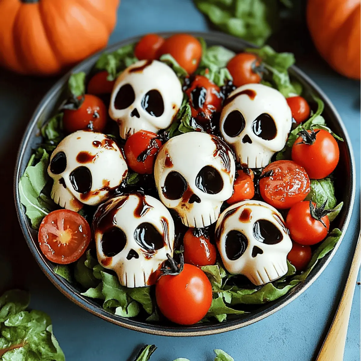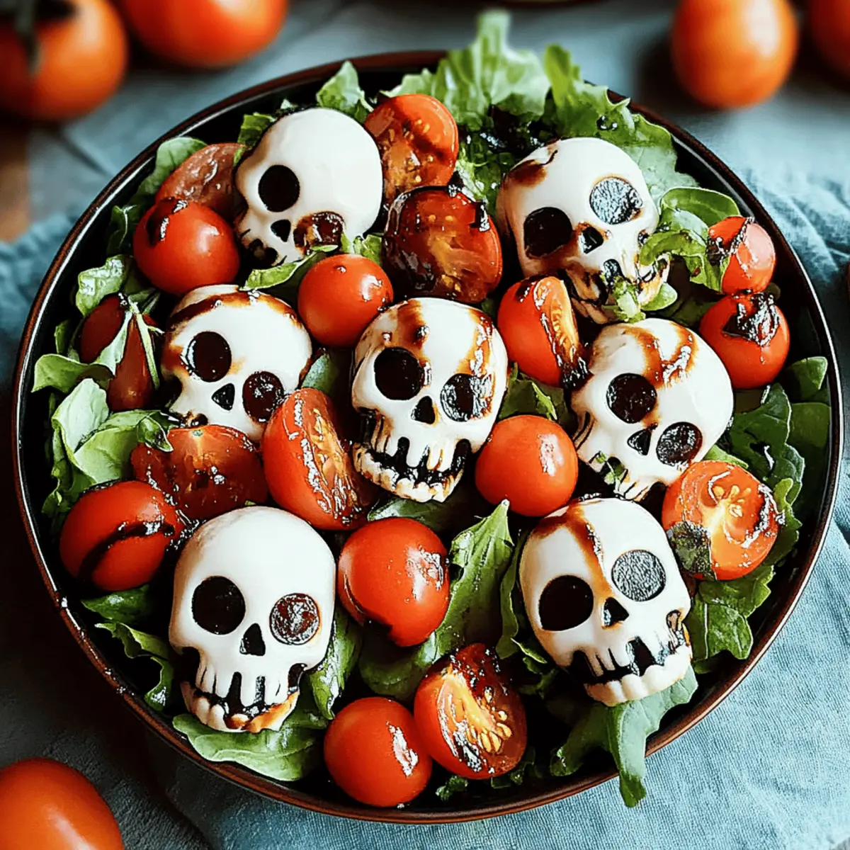 What’s more fun than a spooky surprise at your Halloween gathering? Enter the Spooky Halloween Salad with Mozzarella Skulls, a playful dish that captures the spirit of the season while keeping things refreshingly healthy. This festive salad combines sweet cherry tomatoes and vibrant mixed greens, all dressed in a tangy balsamic glaze. Not only is it visually striking, but it also serves as a delightful twist on your typical holiday fare, making it a perfect centerpiece for any Halloween feast. With easy preparation that allows you to whip this up in no time and the ability to impress both kids and adults alike, this salad will be the talk of the table. Ready to explore how to make your Halloween a little more delicious this year? Why is this Halloween salad so special? Unique Presentation: Your guests will be captivated by the playful mozzarella skulls nestled atop a bed of vibrant greens. Healthier Option: Unlike standard Halloween treats, this salad is both festive and nutritious, packed with vitamins and flavor. Versatile Ingredients: Feel free to customize the base greens or add seasonal toppings like toasted pumpkin seeds for extra crunch. Crowd-Pleaser: This dish strikes a perfect balance between whimsical and gourmet, making it perfect for both kids and adults at your gathering. Quick & Easy: You can whip up this eye-catching salad in under 30 minutes, letting you enjoy more time celebrating with your loved ones! Spooky Halloween Salad Ingredients • Get ready to create a festive dish! For the Salad Mozzarella Balls – Perfectly creamy and fun for a Halloween theme; alternatively, use a large mozzarella ball cut into cubes. Mixed Salad Greens – Fresh greens provide a vibrant base; any soft greens like arugula or spinach work great. Cherry Tomatoes – These add a delightful burst of sweetness; consider using small heirloom tomatoes for variety. Fresh Basil – This aromatic herb elevates the flavor; while dried basil can be used, fresh is recommended for the best taste. For the Dressing Olive Oil – Serves as the base; opt for high-quality extra virgin olive oil for optimal flavor. Balsamic Glaze – This tangy-sweet addition is key; homemade (reduced balsamic vinegar) enhances the overall flavor. Flaky Sea Salt – A touch of this seasoning highlights the dish’s flavors perfectly. Freshly Cracked Black Pepper – Adds a mild spice to balance the dish nicely. For Optional Flavor Lemon – A splash of this bright acidity enhances the salad’s fresh flavors; feel free to squeeze a bit over just before serving! Enjoy assembling your delicious Spooky Halloween Salad while embracing the creativity of the season! Step‑by‑Step Instructions for Spooky Halloween Salad Step 1: Preheat the Oven Start by preheating your oven to 350°F (175°C). This temperature is perfect for baking the mozzarella skulls, ensuring they soften just enough to shape them without completely melting. While the oven heats up, gather your mozzarella balls and skull molds, ready for some fun. Step 2: Prepare Mozzarella Skulls Once the oven is preheated, place mozzarella balls into the skull molds, fitting them snugly. Bake for about 6 minutes, keeping an eye on them; they should be soft and slightly puffed but not completely melted. The anticipation of these spooky shapes will get everyone excited for the salad! Step 3: Shape Skulls After baking, remove the mozzarella from the oven and press down on each ball firmly to form the skull shapes. Once shaped, transfer the molds to the refrigerator for 10 to 15 minutes. This step helps the mozzarella firm up, ensuring the skulls retain their spooky form when released. Step 4: Assemble Salad In a large mixing bowl, add your mixed salad greens. Drizzle with olive oil—about two tablespoons will do—and if you’re using lemon, squeeze some juice for an added zing. Toss everything gently until the greens are well coated; they should glisten and look vibrant. Step 5: Add Toppings Layer your assembled greens with sliced cherry tomatoes and your freshly made mozzarella skulls. Scatter fresh basil leaves for an aromatic touch. To finish off your Spooky Halloween Salad, drizzle with balsamic glaze and sprinkle flaky sea salt and cracked black pepper over the top for flavor. Step 6: Serve Your Spooky Halloween Salad is now ready to shine! Serve it immediately for the best texture and freshness, allowing guests to marvel at the playful presentation. This salad is not just a healthy option; it’s a delightful centerpiece for any Halloween gathering! Expert Tips for Spooky Halloween Salad Mold Matters: Ensure mozzarella balls are pressed firmly into molds for defined skull shapes; a proper fit creates the perfect spooky look. Balsamic Brilliance: Use high-quality balsamic glaze for the best flavor; homemade is the secret ingredient that elevates your Halloween salad. Freshness Factor: Assemble the salad just before serving to maintain the greens’ crispness; keep dressing separate if preparing in advance. Creative Customizations: Feel free to switch up greens; arugula or kale adds unique flavors and textures that match the festive theme. Chilling Tips: Make mozzarella skulls ahead of time; they store well in the fridge for up to 24 hours, allowing for easy party prep! How to Store and Freeze Spooky Halloween Salad Fridge: Keep any leftover salad without dressing in an airtight container for up to 2 days to preserve freshness. Store mozzarella skulls separately to maintain their shape. Freezer: Freezing is not recommended for the assembled salad as the greens and mozzarella will lose their texture. Instead, consider preparing the mozzarella skulls in advance and refrigerating them for up to 24 hours. Reheating: If you’re using leftovers, enjoy cold as a refreshing bite. Add a drizzle of dressing and fresh toppings before serving to enhance flavors. Preparation Tips: Wash and pre-cut your salad ingredients in advance, keeping them in the fridge to save time during yo
