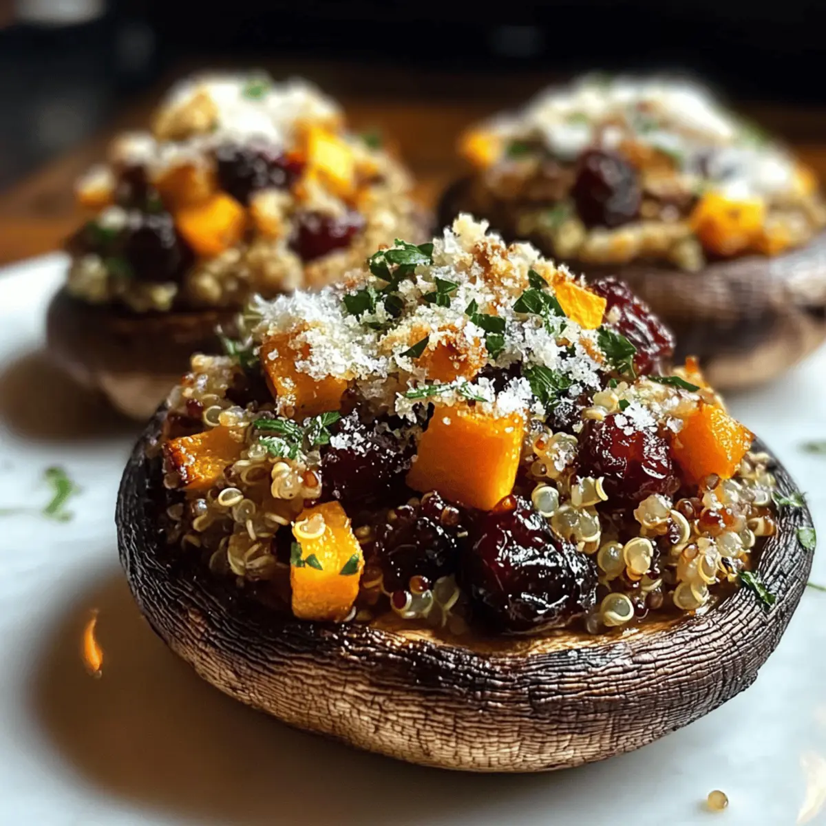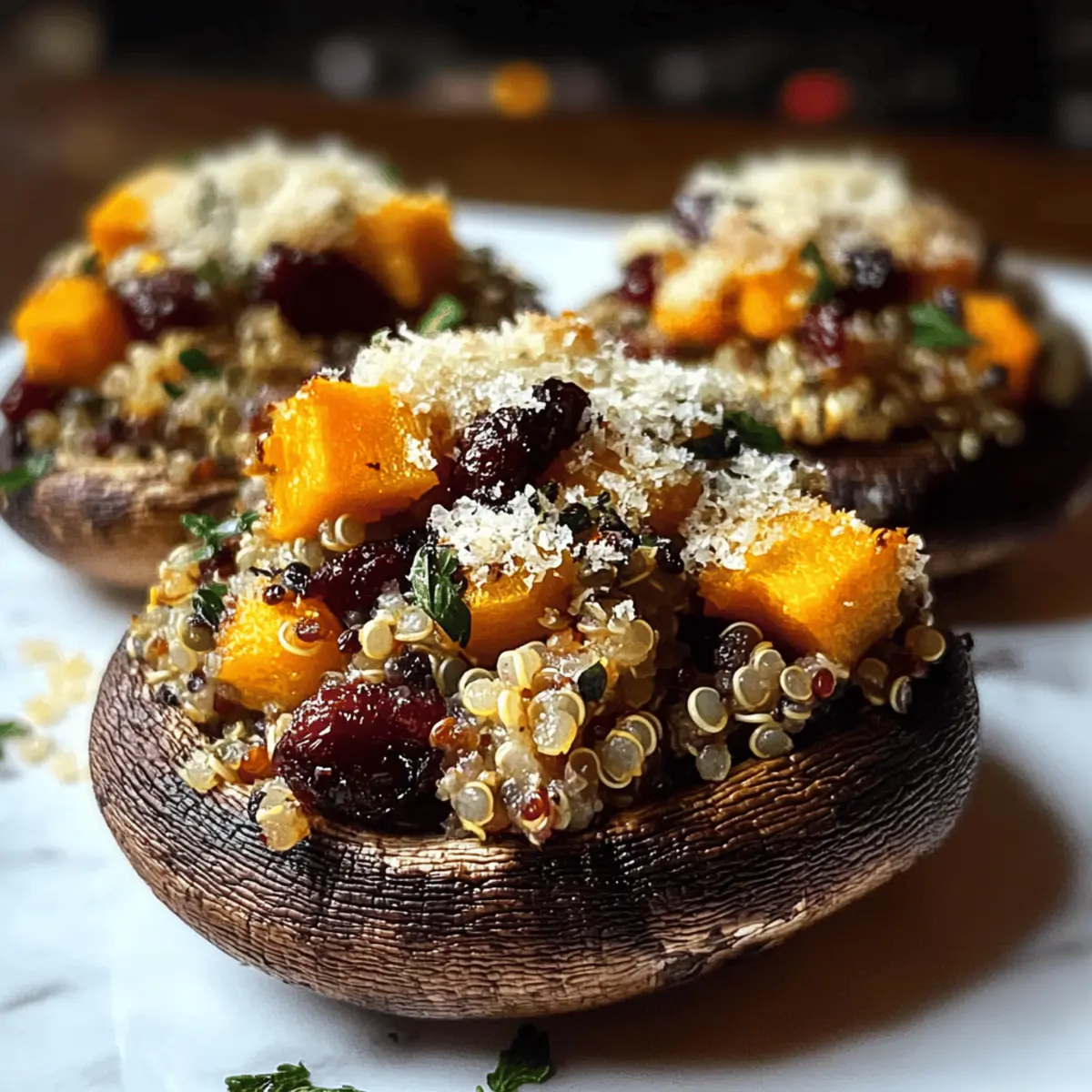 As the leaves turn and the air grows crisp, my kitchen transforms into a cozy haven teeming with the flavors of fall. That’s when I turn to my beloved Autumn Harvest Stuffed Portobello Mushrooms, a dish that captures the spirit of the season with hearty butternut squash, nutritious quinoa, and a hint of sweetness from cranberries. What makes this recipe a delightful find, aside from being vegetarian and gluten-free, is its quick preparation time—perfect for those bustling weeknights when I crave something both comforting and colorful. Plus, these stuffed mushrooms double as a show-stopping centerpiece for any table! Ready to savor autumn’s bounty in a way that feels as nourishing as it is delicious? Why are Stuffed Portobello Mushrooms a Must-Try? Simplicity is key! This delicious dish comes together in under an hour, making it perfect for busy weeknights. Hearty and Healthy with nutritious quinoa and seasonal butternut squash, you won’t compromise on flavor. Versatile options are endless—swap quinoa for brown rice or add leafy greens for extra nutrition. Crowd-Pleaser status is assured; everyone will rave about these vibrant and filling stuffed mushrooms. For a delightful side, consider pairing them with a crisp salad or some crusty bread, just like in my recipe for Stuffed Portobello Mushrooms. Enjoy the comforting embrace of autumn in every bite! Stuffed Portobello Mushrooms Ingredients For the Filling Portobello Mushrooms – These serve as the delicious base, providing both structure and a rich flavor. Quinoa – A wonderful source of protein and texture; feel free to substitute with brown rice or couscous for variety. Butternut Squash – Adds a hint of sweetness and that cozy autumn flavor; ensure it’s tender before mixing it in. Garlic – Fresh garlic will enhance the overall aroma and taste of your dish. Fresh Thyme – This herb brings out the best of the fall flavors, making the stuffing aromatic and delightful. Dried Cranberries – They introduce a natural sweetness and a chewy texture that complements the savory elements. Chopped Walnuts – These provide a satisfying crunch and healthy fats; you can omit them for a nut-free dish. Parmesan Cheese – This creates a deliciously golden and crispy topping; use nutritional yeast for a vegan alternative. For Cooking Olive Oil – Essential for brushing the mushrooms and cooking the squash, it adds moistness and a touch of flavor. These Stuffed Portobello Mushrooms are not just filling; they are an ode to autumn, bursting with flavor and warmth that’s sure to delight everyone at the table! Step‑by‑Step Instructions for Autumn Harvest Stuffed Portobello Mushrooms Step 1: Preheat and Prepare Preheat your oven to 375°F (190°C) while you line a baking sheet with parchment paper. Take your portobello mushrooms and gently clean them with a damp cloth, removing the stems and gills. This will make room for a generous stuffing. Brush each mushroom cap with olive oil and season them with salt and pepper to enhance their flavors. Step 2: Cook Quinoa In a medium pot, bring vegetable broth or water to a rolling boil. Add the rinsed quinoa, then reduce the heat to low, cover, and let it simmer for about 15 minutes until fluffy. You’ll know it’s ready when the grains have expanded, and the liquid is absorbed. This hearty base will make your stuffed portobello mushrooms truly satisfying. Step 3: Sauté Butternut Squash While the quinoa cooks, heat a tablespoon of olive oil in a large sauté pan over medium heat. Add diced butternut squash and cook for about 10 minutes until tender and lightly golden. Stir occasionally to prevent sticking. In the last couple of minutes, add minced garlic and fresh thyme, cooking until fragrant for a delightful aroma in your kitchen. Step 4: Combine the Filling In a mixing bowl, combine the fluffy quinoa, sautéed butternut squash, dried cranberries, and chopped walnuts. Gently mix until all ingredients are well incorporated. This vibrant filling will bring a medley of flavors to your stuffed portobello mushrooms, featuring sweetness, crunch, and heartiness all in one bite. Step 5: Stuff the Mushrooms Next, take each portobello mushroom cap and use a spoon to generously fill them with the quinoa mixture. Pack the filling high, allowing it to overflow slightly for a rustic look. Finally, sprinkle grated Parmesan cheese on top of each stuffed mushroom, adding extra richness and a beautiful golden crust during baking. Step 6: Bake to Perfection Place the stuffed portobello mushrooms on the prepared baking sheet and slide them into the oven. Bake for 20-25 minutes or until the mushrooms are tender and the cheese is melted and bubbly. Keep an eye on them, as they should be golden brown by the end, creating a visually tempting dish bursting with flavor. Step 7: Cool and Serve After baking, remove the stuffed portobello mushrooms from the oven and let them rest for a few minutes. This step will allow the filling to set slightly, making them easier to handle. Serve warm, and enjoy the comforting flavors of autumn in every delicious bite! Expert Tips for Stuffed Portobello Mushrooms Flavor Boost: Use vegetable broth to cook the quinoa instead of water, enhancing the flavor and richness of your stuffed portobello mushrooms. Gentle Packing: Avoid overstuffing the mushrooms. Gently pack the filling to ensure even cooking and prevent spills while baking. Rest After Baking: Let the stuffed mushrooms rest for a few minutes after baking. This allows the filling to set, making them easier to serve and enjoy. Experiment with Greens: Consider adding sautéed spinach or kale to the filling for extra nutrition and color while maintaining the savory essence of your stuffed portobello mushrooms. Nut-Free Option: If you have nut allergies, feel free to omit the chopped walnuts without sacrificing flavor or texture in the dish. What to Serve with Autumn Harvest Stuffed Portobello Mushrooms As you enjoy the warm, c